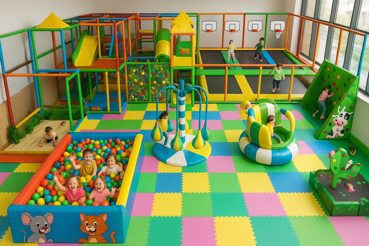 Her yaş grubuna uygun olarak planlanan bu alanlarda; top havuzları, kaydıraklar, tırmanma bölümleri, tüneller, zıplama alanları ve mini spor aktiviteleri bir arada bulunur.